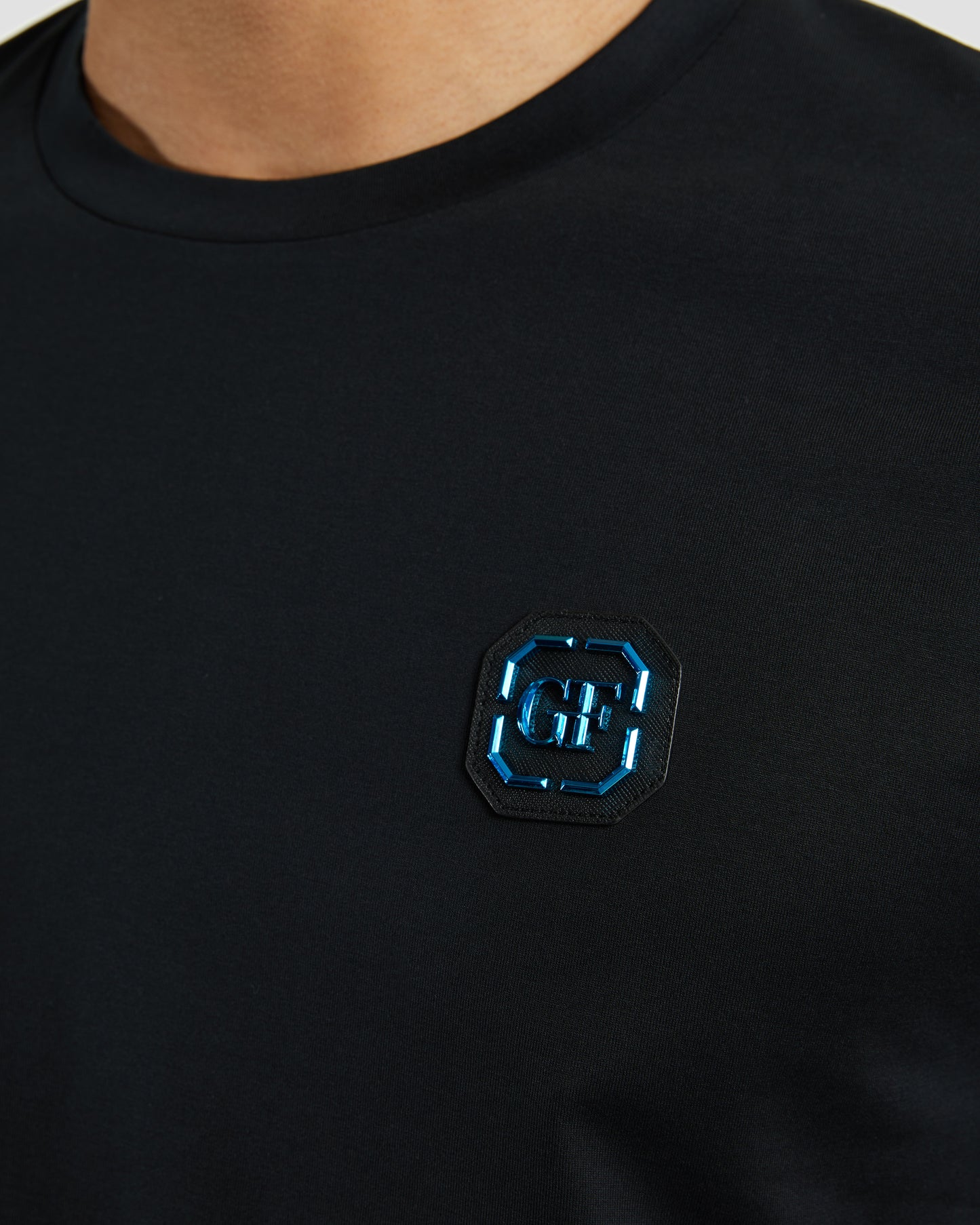 A versatile rotational piece with a subtle striking appeal. This t-shirt crafted from mercerized cotton is patched with a blue metal monogram and leather to chest.