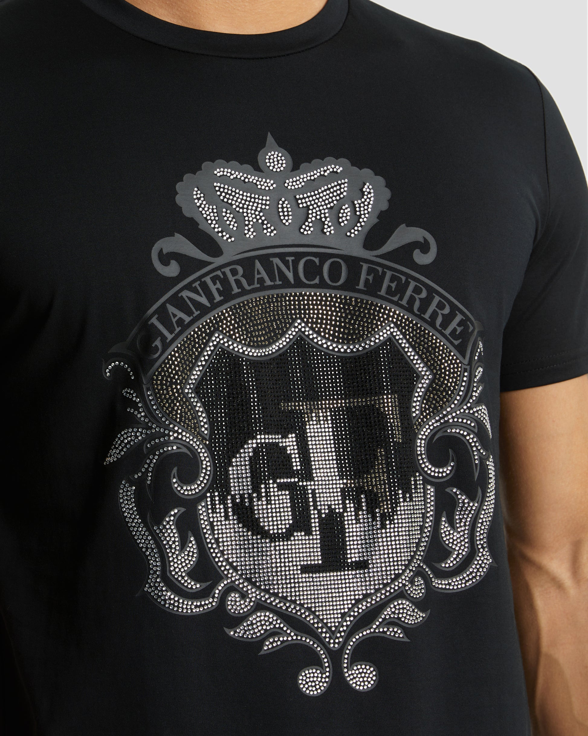 Don a piece with the right balance of contemporary and classical appeal. This black t-shirt is designed with a rhinestones embellished imperial Gianfranco Ferré logo to front crafted in pure mercerized cotton.