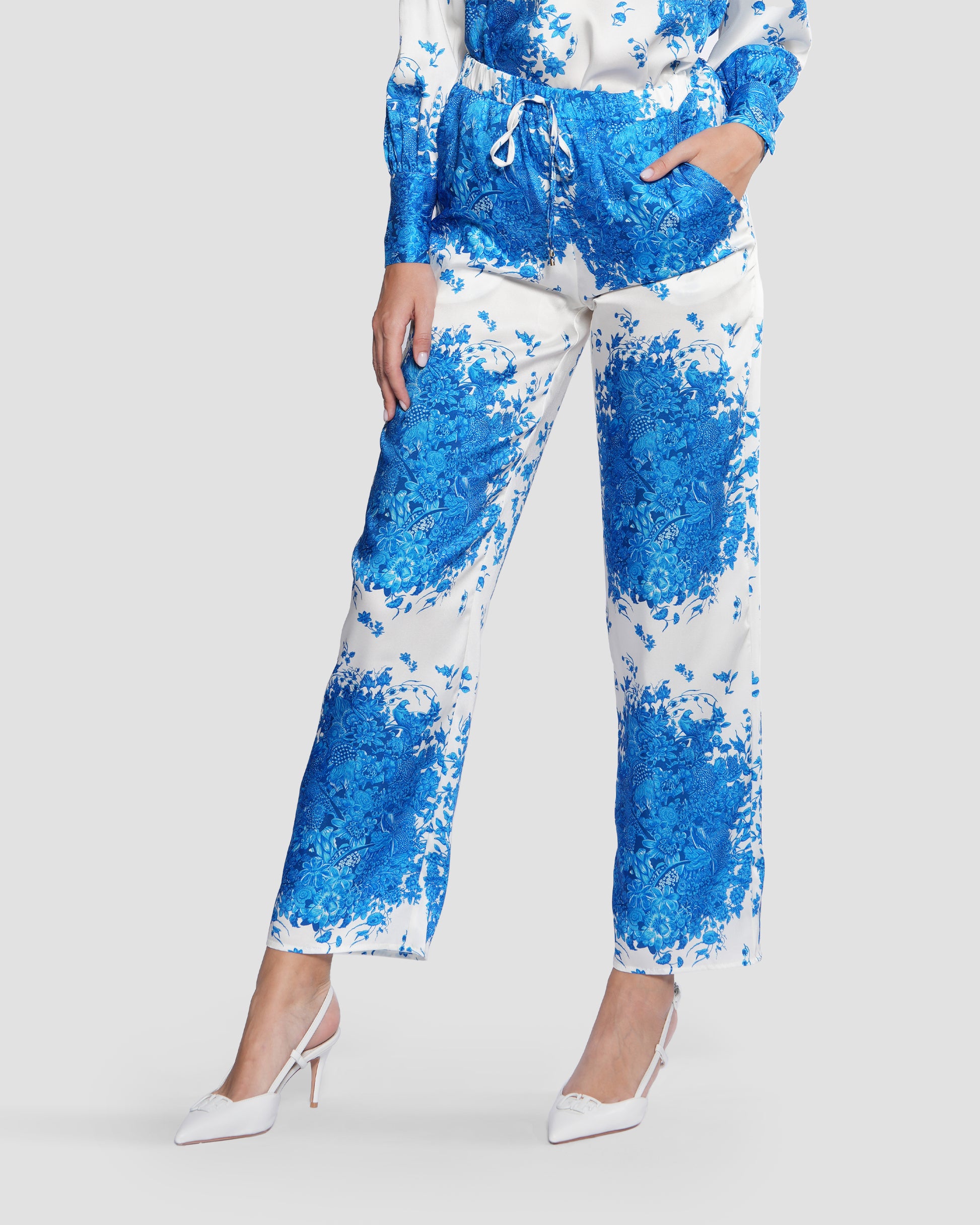 These pants are made from a soft, lightweight material in a vintage-inspired print with shades of blue. The design comes fitted with an elasticated waist with drawstrings and a straight-leg silhouette.