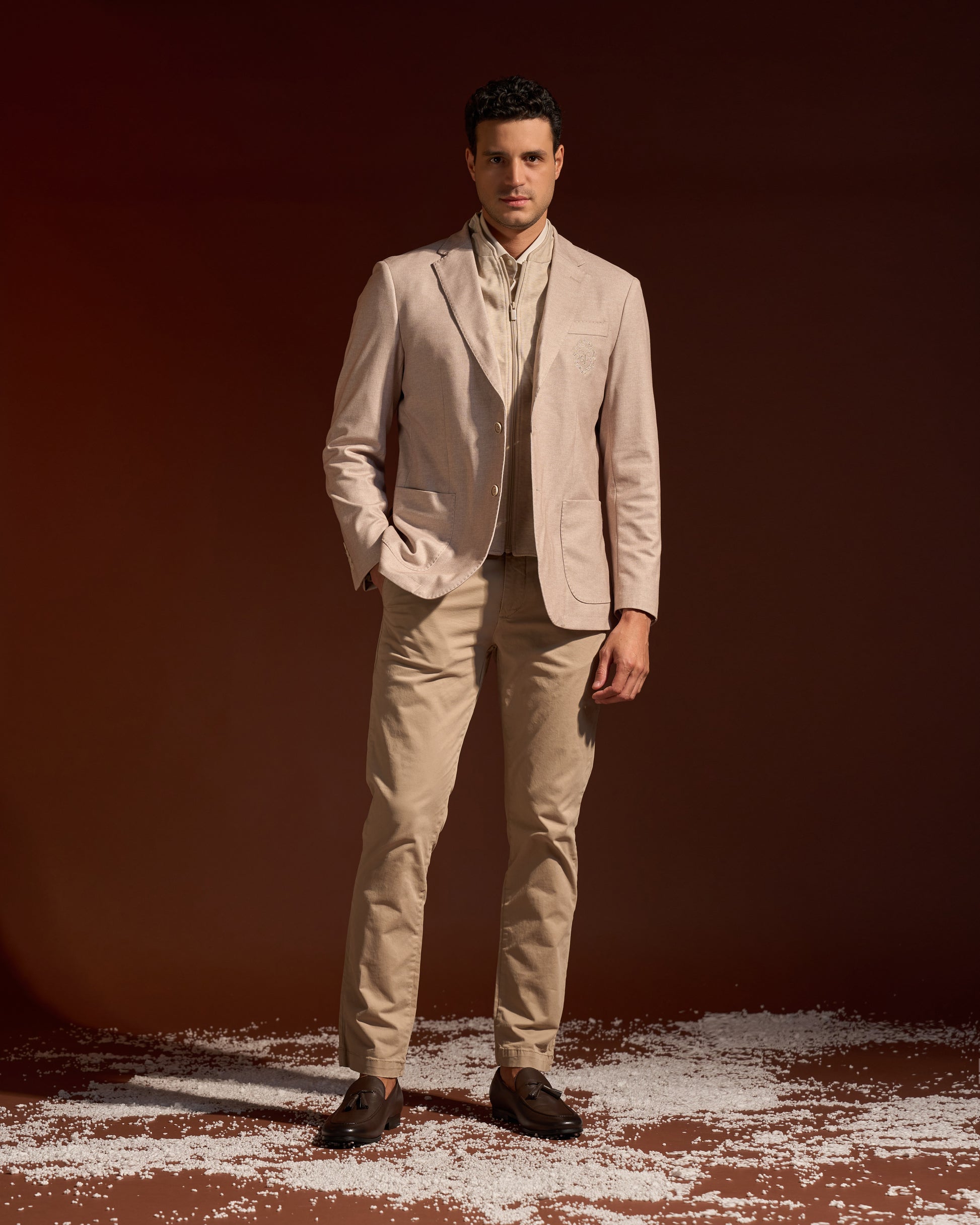 A sleek beige slim-fit blazer featuring a subtle embroidered GF logo. Designed with stretch comfort and a detachable facing for versatile, modern styling.