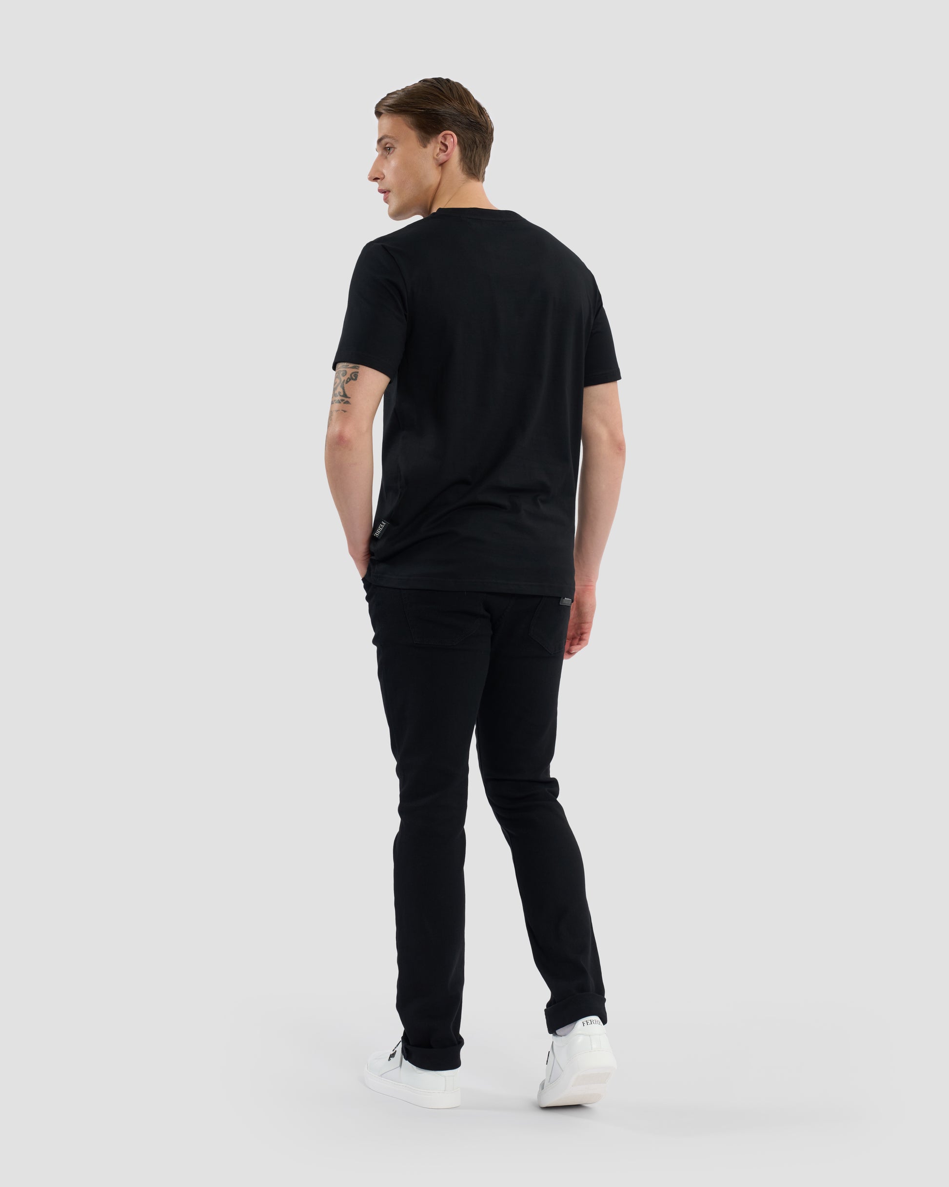 It's in the details. This crisp white t-shirt boasts a contrast-toned Ferré print to front.