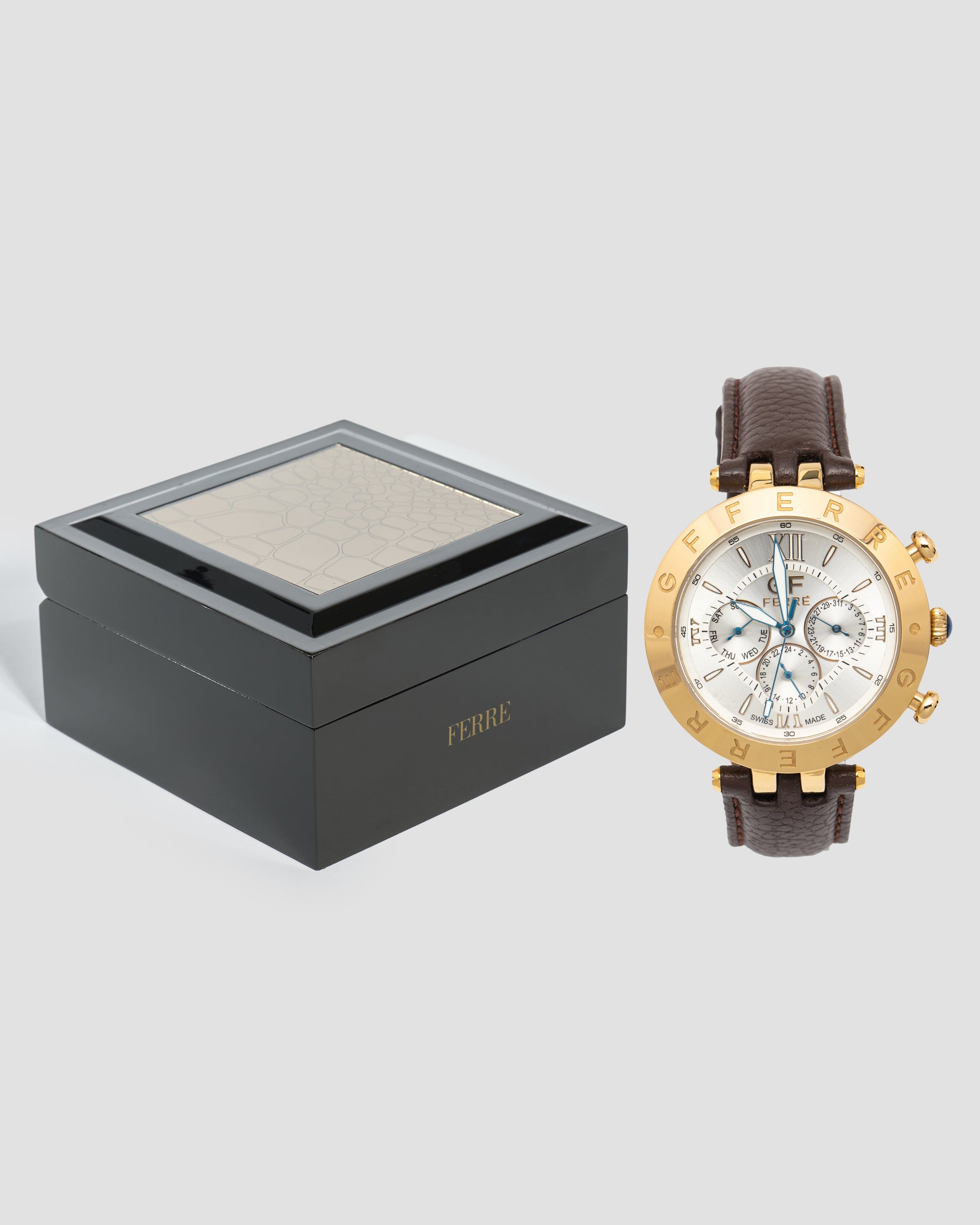 Bold yet classic, the gold-tone case contrasts beautifully with a rich brown leather strap. A timeless accessory for the modern wrist.