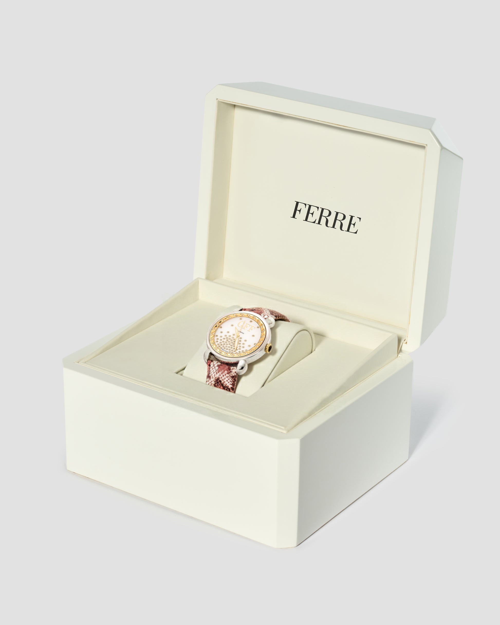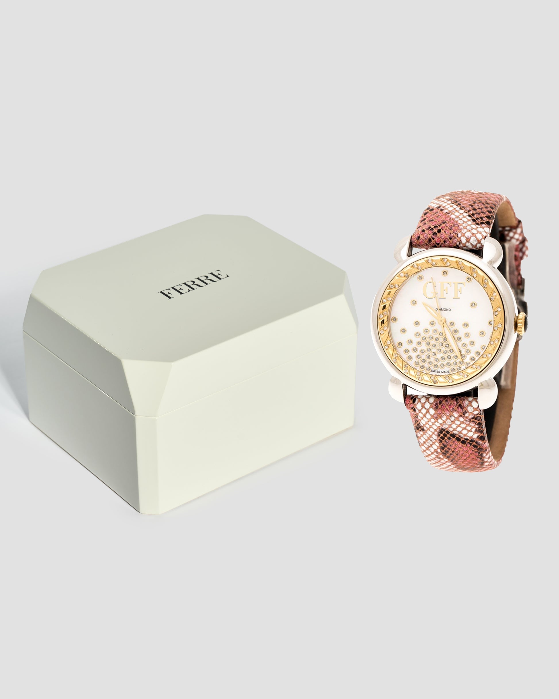 Command attention with this watch. Every gleam of gold and glint of diamond reflects unstoppable confidence, perfectly paired with a chic snakeskin strap for a fierce finishing touch.