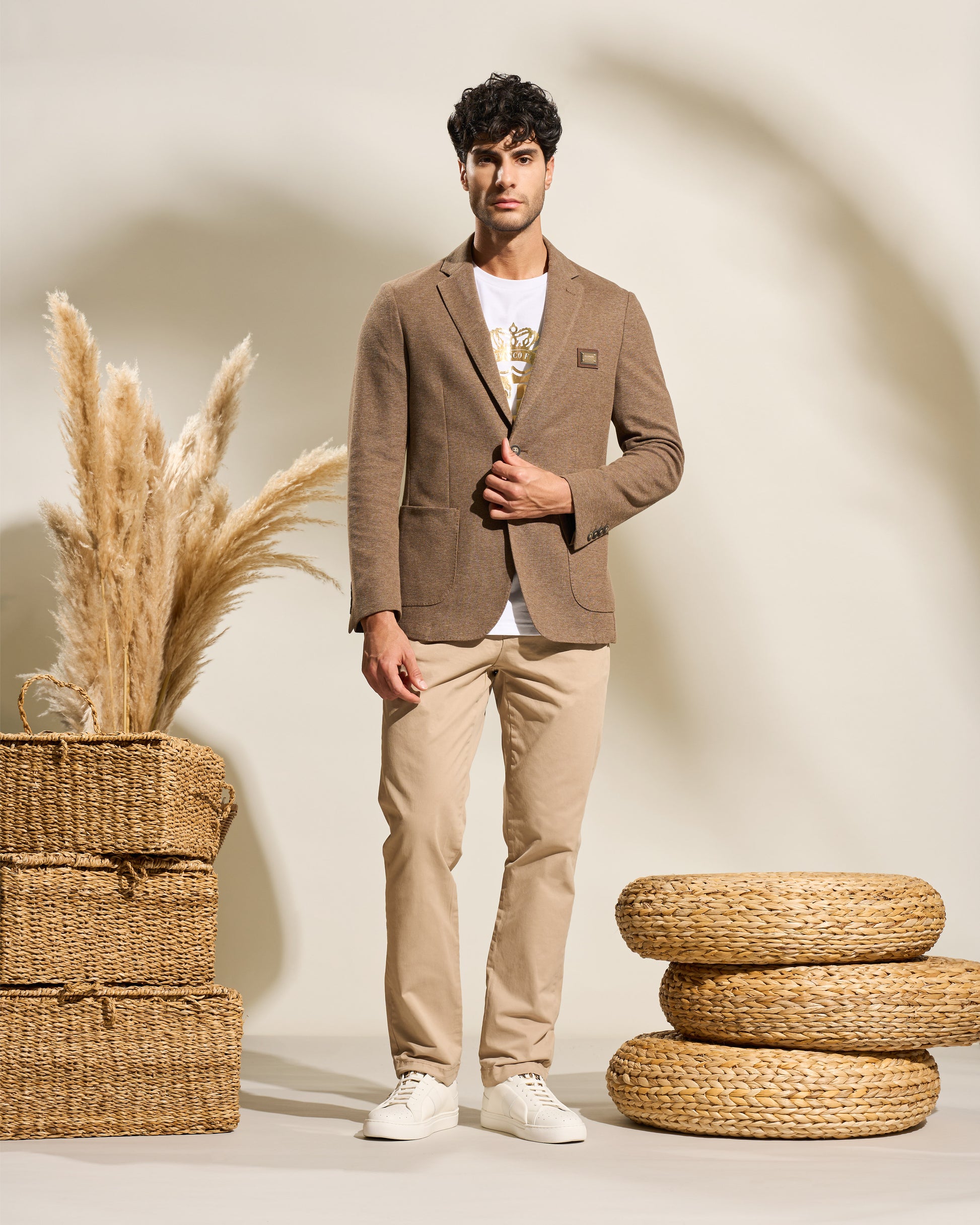 Comfort meets detail. Defined by its clean notch lapel and subtle logo plaque, this jacket brings understated style to any outfit.