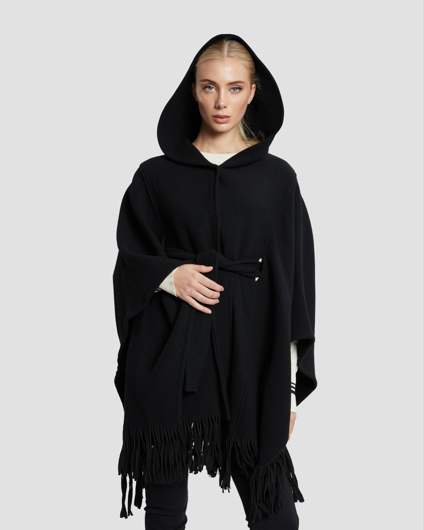 Elegance in versatility. This piece is an updated take on ponchos with its hooded silhouette detailed with fringe hems for a remarkable appeal finished off with tone-on-tone brand embroidery to back.