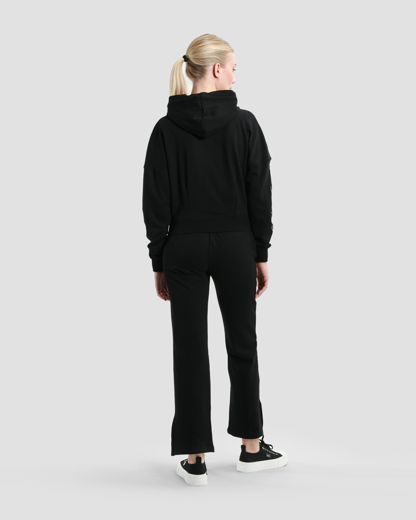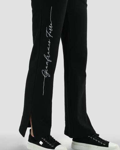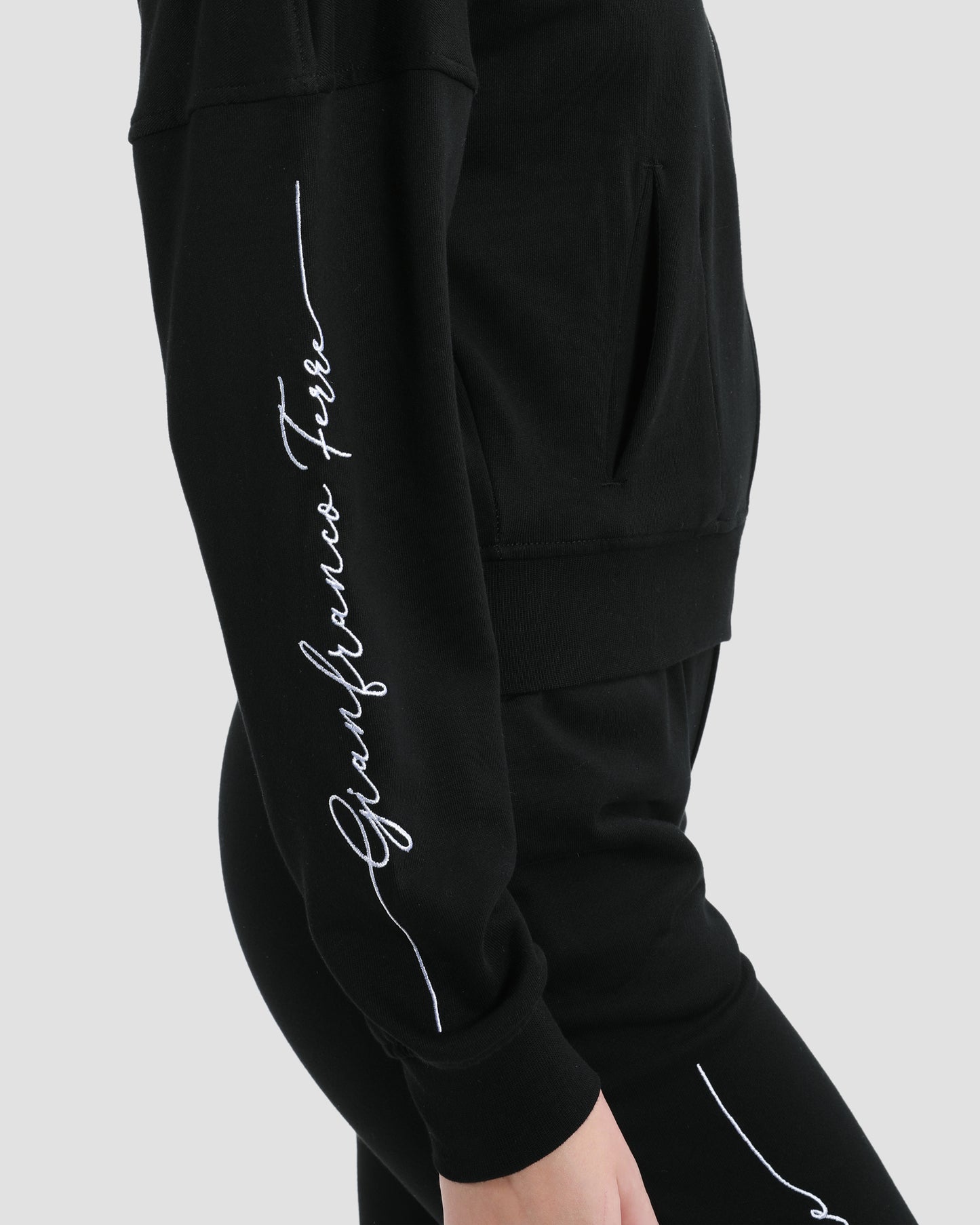 For a contemporary wardrobe essential, this pairing features a hooded jacket with a script embroidered branding to sleeve and a track pants with a script brand embroidery to one leg as well.